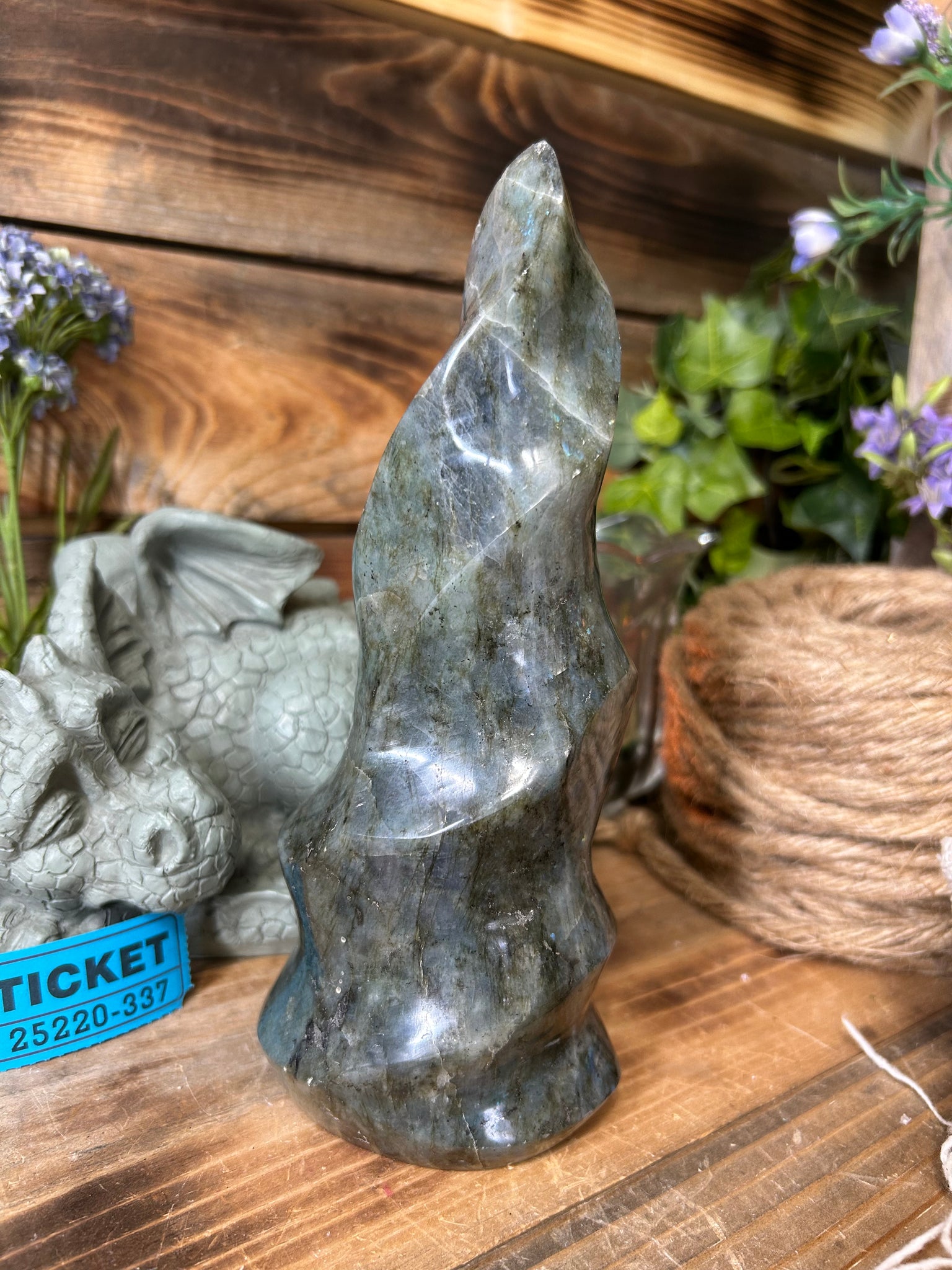 Labradorite is a stone of transformation. It clears, balances and protects the aura. It provides clarity and insight into your destiny, as well as attract success. It is used in metaphysics for dream recall, and finding ways to use dreams in daily life. Mystically, energies of stress and anxiety are reduced by labradorite. It increases intuition, psychic development, esoteric wisdom, help with subconscious issues, and provide mental illumination. It Measures 8" x 3 1/4"